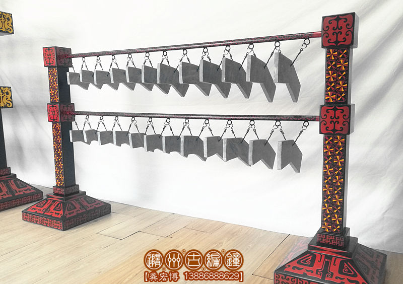 公司復(fù)原制作的24音編磬全長1.8米,寬50厘米,高1.1米;演奏方便,音色亮麗,公司設(shè)計(jì)了編磬木桌放置編磬,長2米,高70厘米,寬60厘米,陳列編磬后總高度:1.8米。木桌內(nèi)做儲(chǔ)藏柜,可方便樂隊(duì)保管其他樂器及服裝,方便實(shí)用。